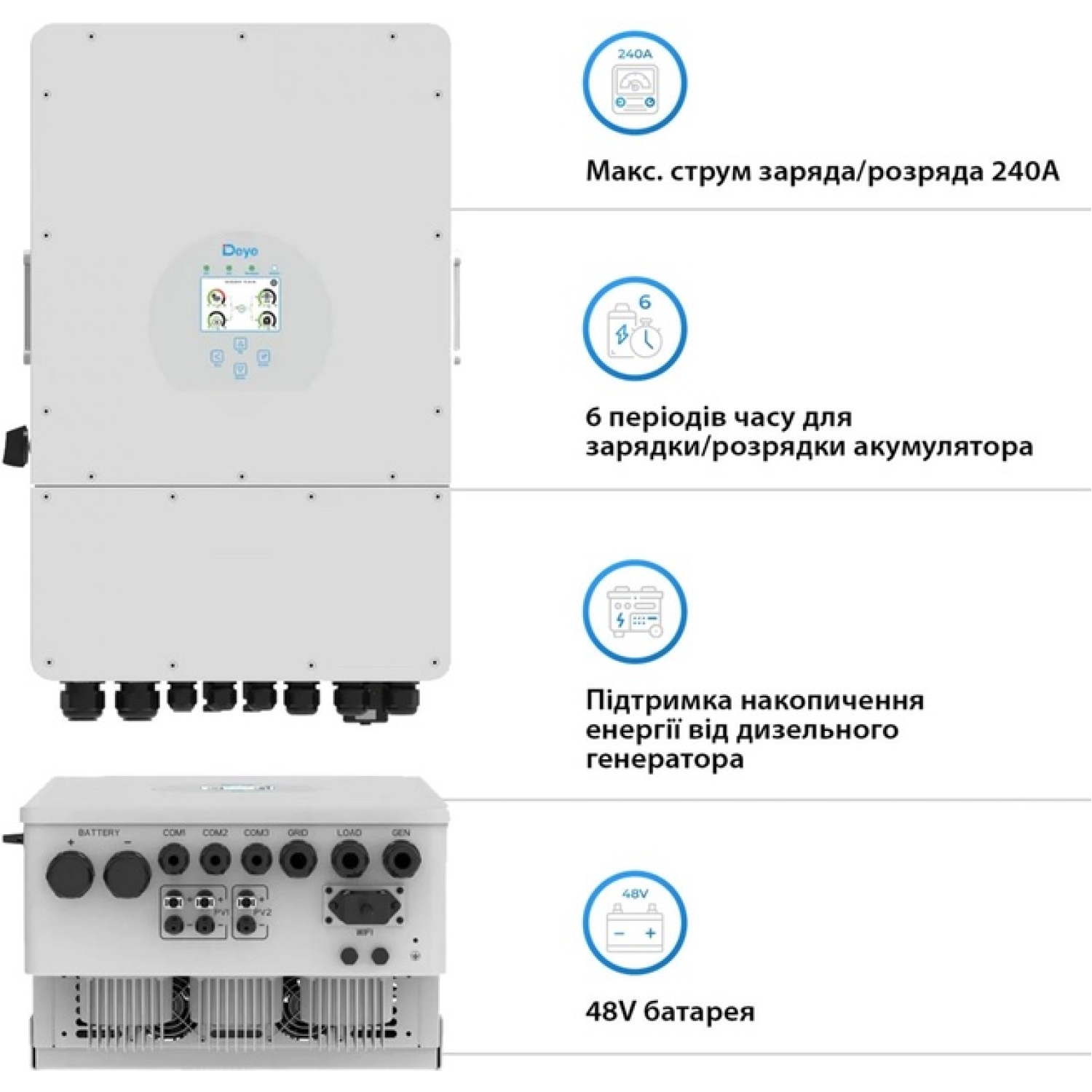 Усі ці функції дозволяють Deye SUN-12K-SG04LP3 працювати з енергією сонця ефективно та надійно, забезпечуючи електроенергію для будь-яких потреб у будинку чи на робочому місці.